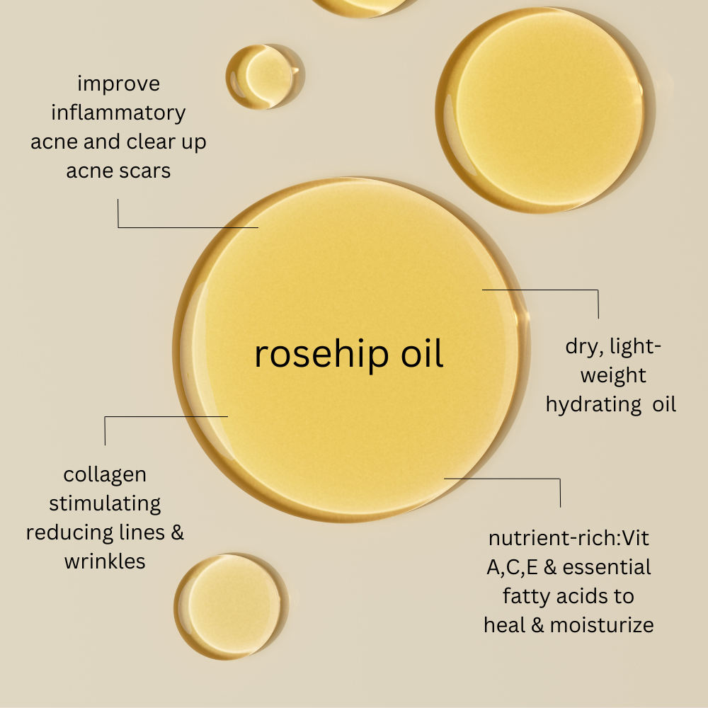100% Organic Rosehip seed oil and Vitamin E oil Excellent for treating acne-prone, dry/dull or inflamed skin. Includes protective antioxidants to repair and protect while high Vitamin C content promotes hydration. Non-greasy & non-comedogenic.