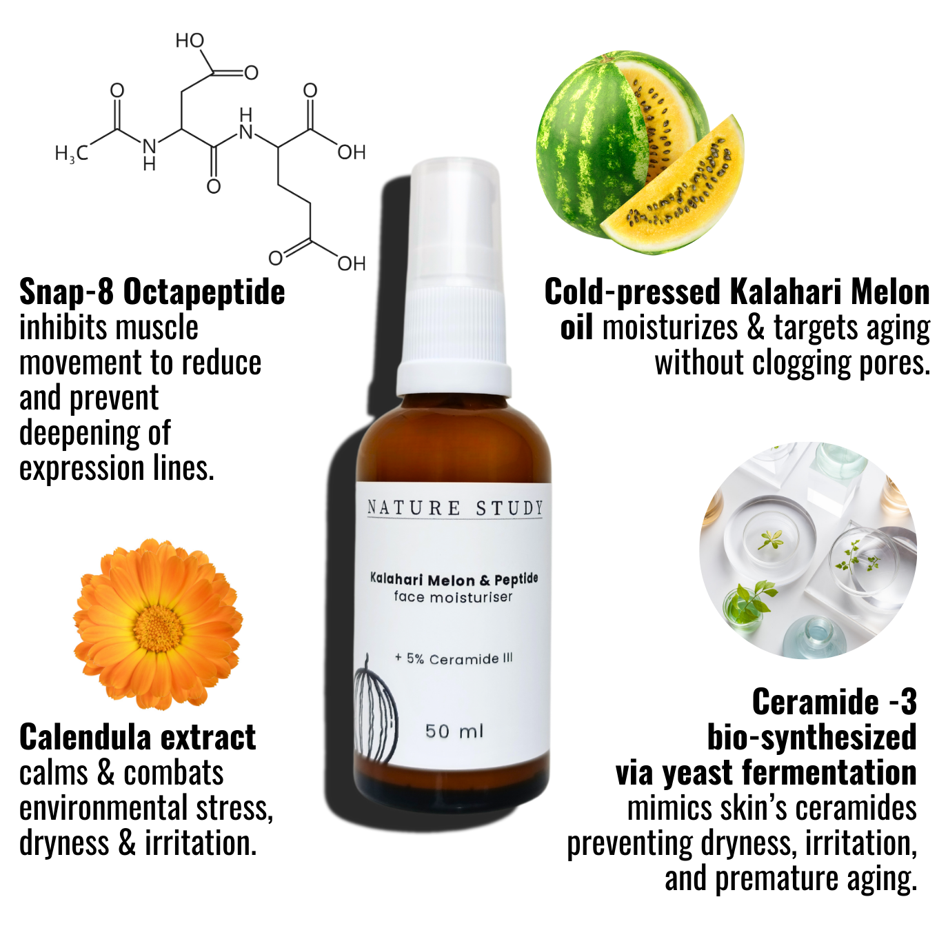 Key ingredients: 5% Snap-8 Peptide, 5% Ceramide 3, Kalahari Melon seed oil, Calendula extract, Hyaluronic acid, Allantoin.