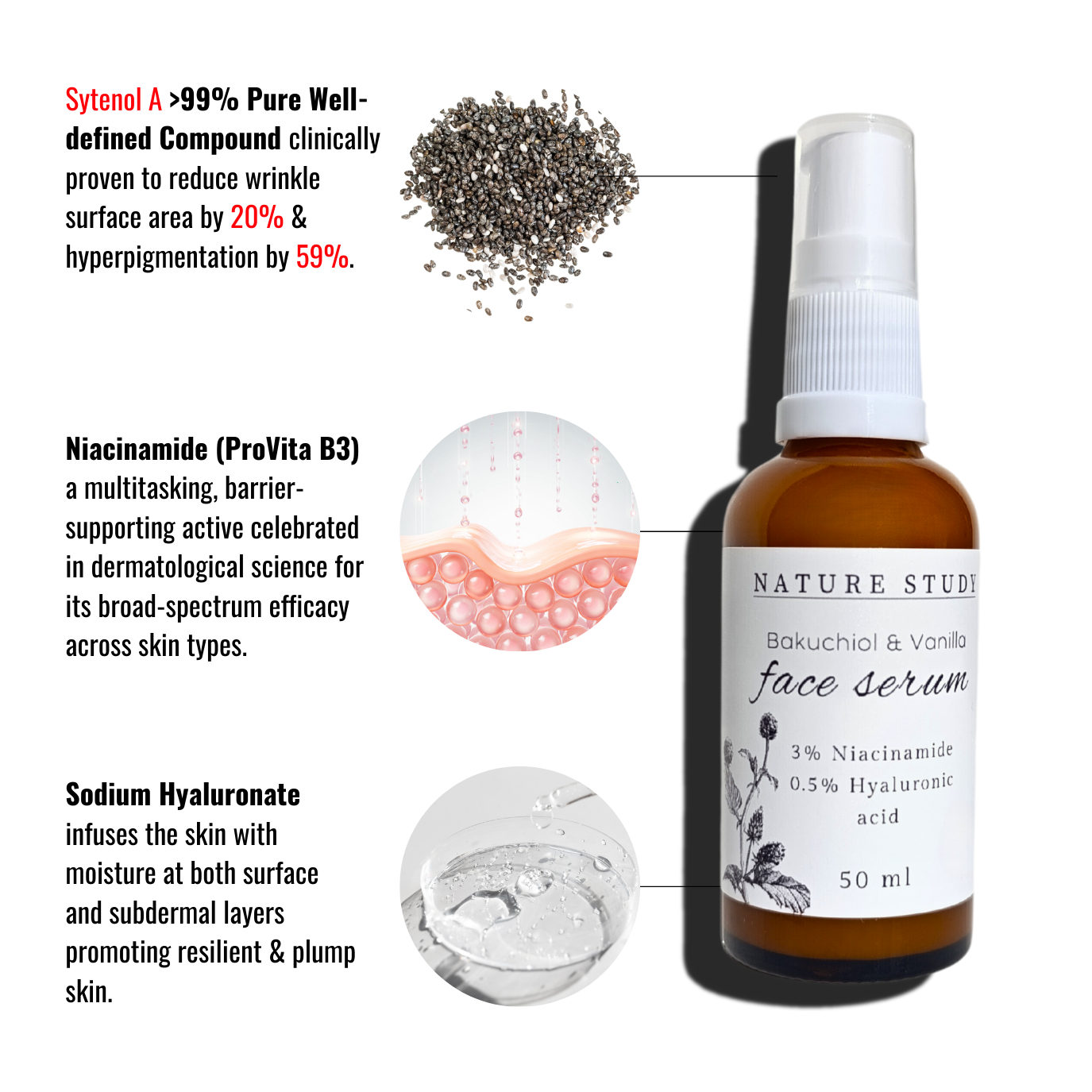 INCI list: Aqua, Vegetable Glycerin, Nicotinamide (Niacinamide), Hydrolyzed Wheat Protein, Caprylic Capric Triglycerides, Citrullus Lanatus (Kalahari melon) seed Oil, Benzyl Alcohol, Benzoic Acid, Dehydroacetic Acid, Tocopherol, Xanthan gum, 1% Bakuchiol, 0.5% Sodium Hyuloronate, Vanilla Planifolia extract, Mixed tocopherols.